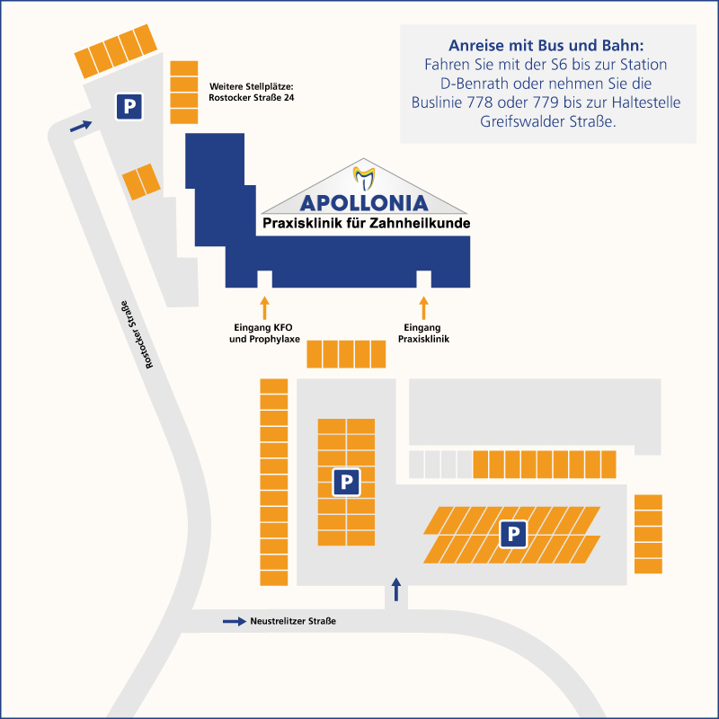 Die im Süden Düsseldorfs liegende Apollonia Praxisklinik erreichen Sie aus Holthausen schneller als Sie denken! Wenn Sie mit dem Auto kommen, finden Sie Parkplätze für Patienten direkt vor der Praxis.